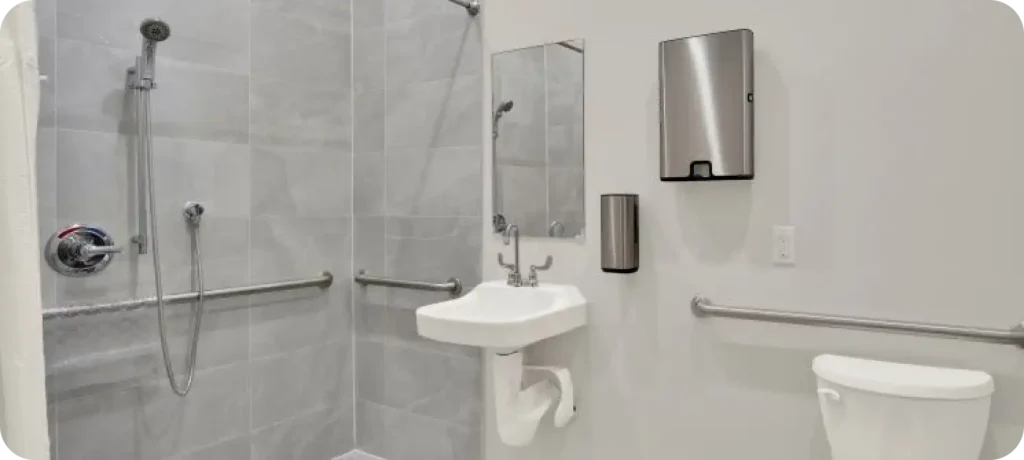 Bathrooms are designed with walk-in showers, grab bars, non-slip flooring, and seated options to promote safe independence. Outdoor green spaces, private call areas, and an on-site beauty salon further enhance daily comfort and convenience.